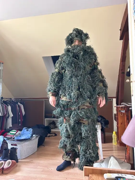 Ghillie de camouflage forestier, utilisé pour la pratique de l'airsoft.