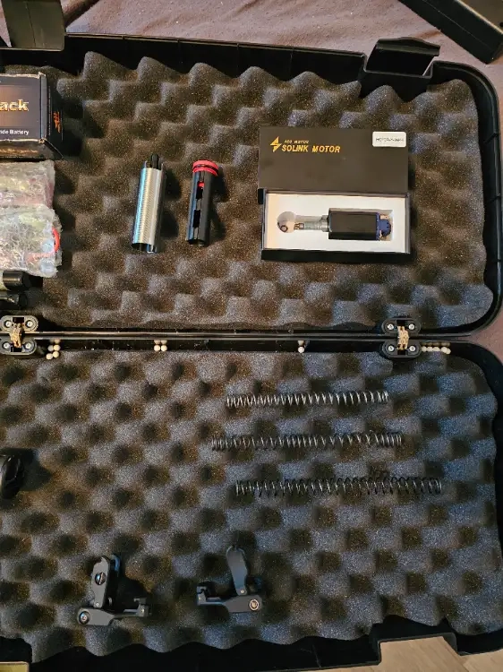 Je donne plusieurs ressorts pour pouvoir modifier la puissance, elle possède un canon précision, bloc hop-up gate, joint maple leaf 60°, moteur SOLINK Super High Torque 36K - Long, silencieux sur roulement a billes, lunette x1-x5, poignée légère, torche, 4 chargeur, 5 batterie, malette de transport.
