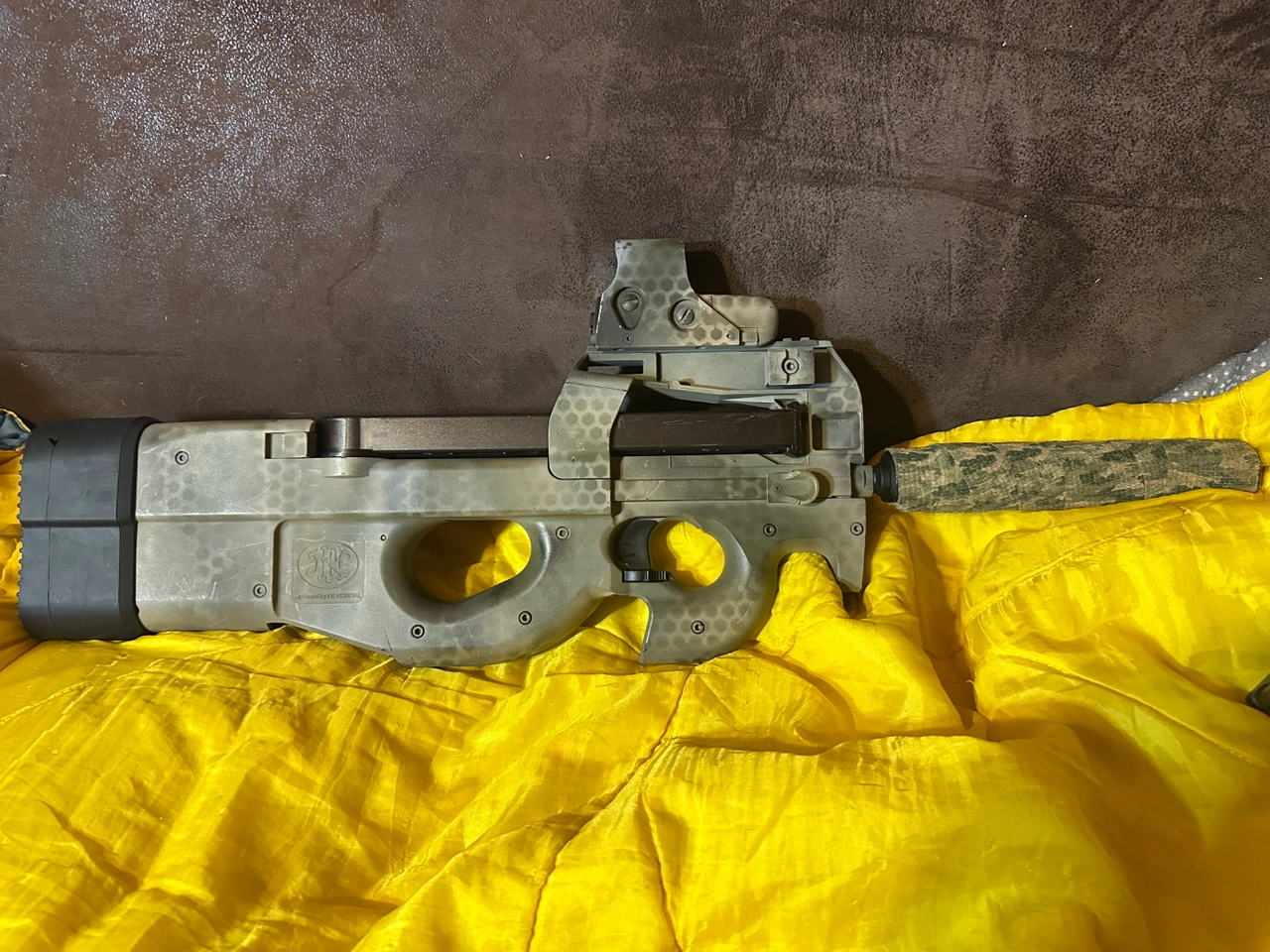 P90 cybergun upgradé high torque moteur et engrenages + mosfet perun, canon de précision et joint hopup. C'est tres rapide et nerveux.