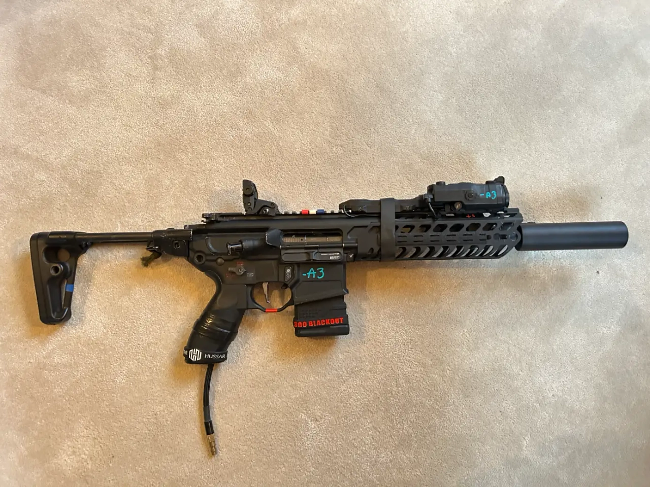En ajoutant un silencieux avec mousse Silverback la replique devient silencieux comme un monastère. Et vous pouvez régler la cadence avec le FCU (dans la poignée)