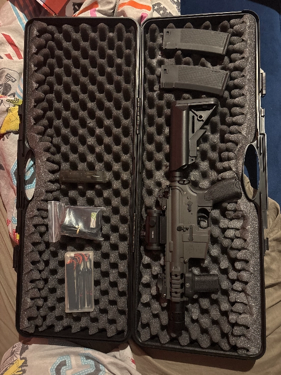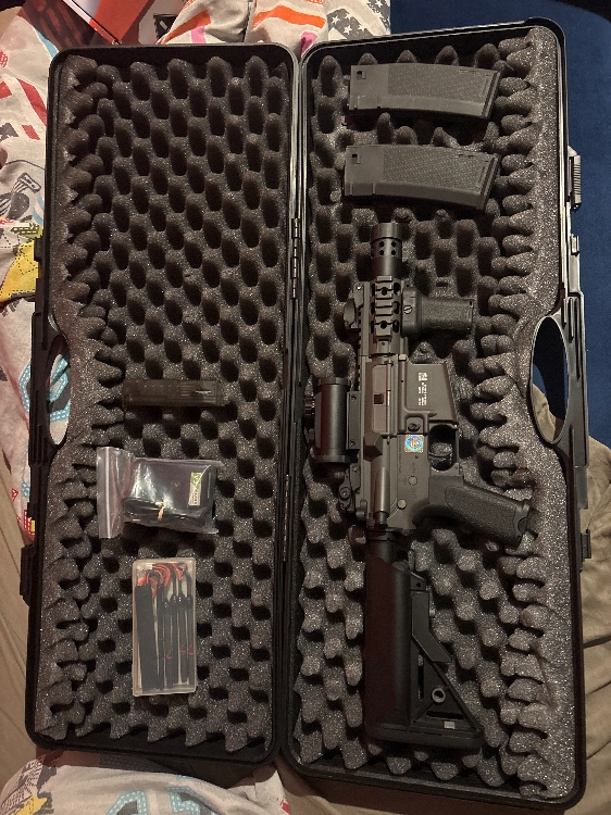 Je vends cette réplique avec : La réplique, un viseur point rouge, 3 batteries, un chargeur batterie, un recharge rapide et 2 chargeur. (Boîte d’origine et mallette de transport)
