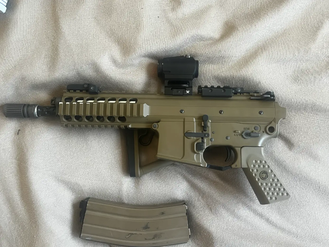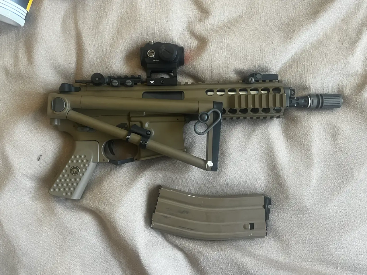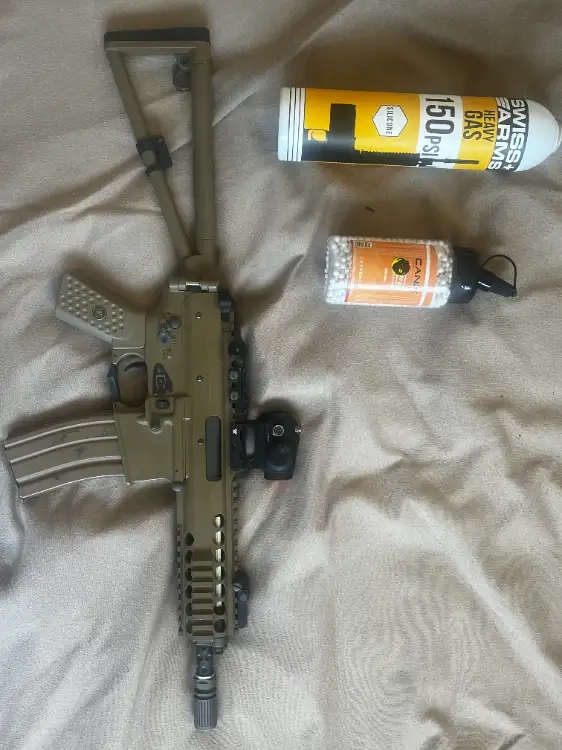Je vends une réplique airsoft à gaz type GBBR (Gas Blow Back Rifle) de la marque WE, modèle PDW (ou type SCAR/AR-15 compact selon configuration), en parfait état de fonctionnement et très peu utilisée.