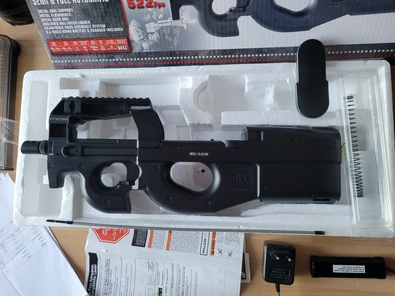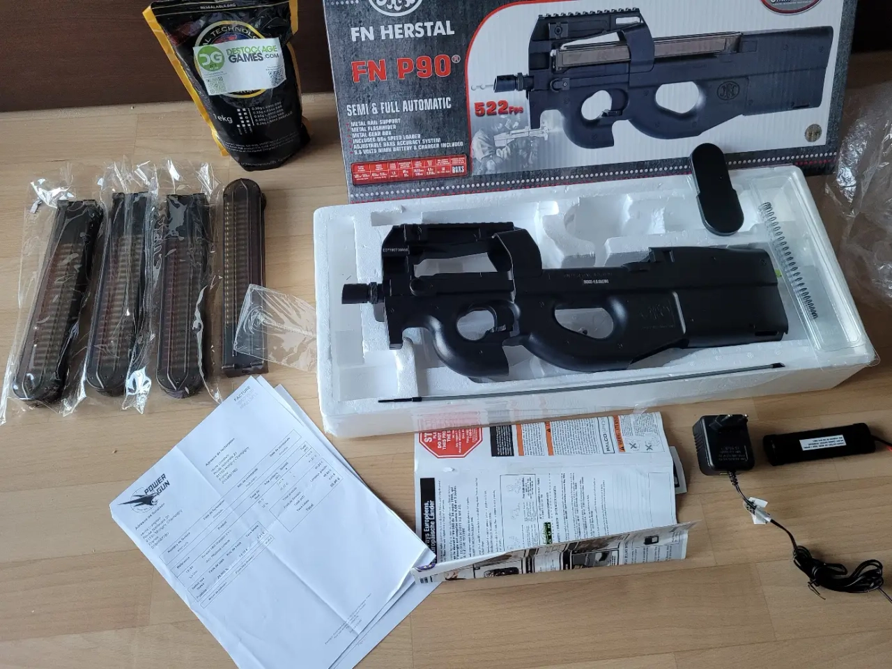 Je la vends avec sa boîte d'origine, ses accessoires de base (batterie d'origine, chargeur de celle-ci, tige de débourrage), le ressort d'origine, 4 chargeurs mid-cap (capacités 70 billes), et un paquet de 1kg de billes 0.25g.