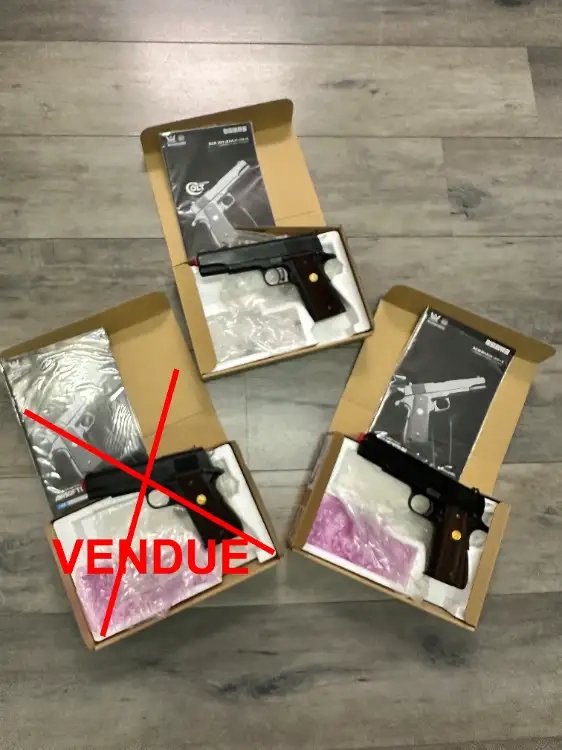 Bonjour, Je vends 2 répliques de poing Western Arms Colt de type 1911 (marquages hyper réalistes), état quasi neuve, jamais servie.