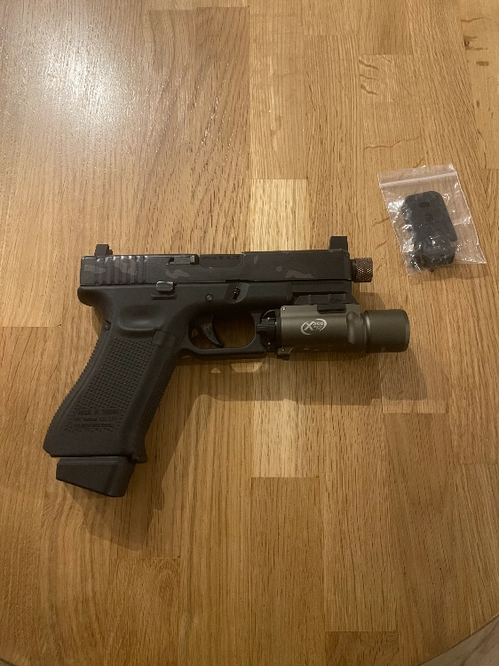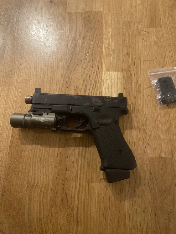 Un Glock 19X WE avec high sights et sticker black Multicam skin zone