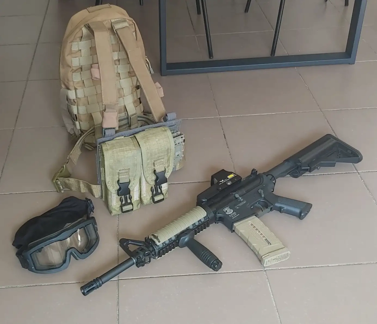 Le gear est micmac de ce que je possédais pour proposer un ensemble complet (boire, recharger, transporter ses affaires personnelles comme clés, téléphone, etc). À l’arrière c’est un sac à dos Lancer tactical, il y avait des crochets à l’intérieur que j’ai coupé pour les réutiliser ailleurs, à l’intérieur il y a une poche d’hydratation 1L acheté chez Decathlon. Les bretelles sont celles d’un autre sac à dos (Viper tactical) elles servent à clipser le front panel équipé de 2 portes chargeur pour AR et un porte chargeur PA. Le front panel est également doté d’une sangle d’un vieux holster, je le faisais passer par des passant du sac à dos pour que le tous tienne autour du corps.
