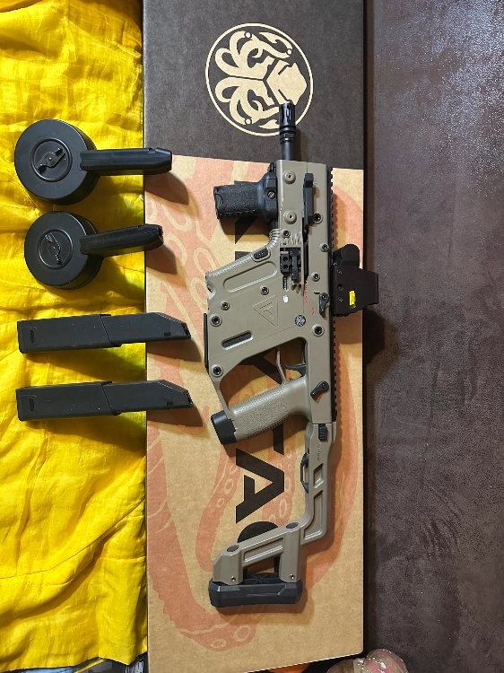 avec 2 chargeurs midcap 95 billes et 2 chargeurs drum 400 coups, avec extension pour mettre la batterie, une poignée tactique, et un viseur holographique de chez swiss arms.