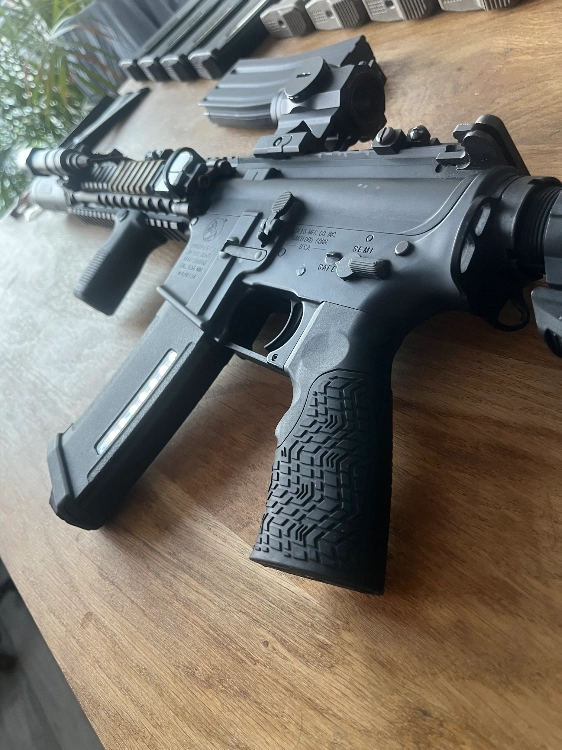 La replique avec le full upgrade de chez RTP avec mosfet LEVIATHAN (1 100)€ + 9 chargeurs PTS (252€) + poignée arrière DD avec moteur high torque slim (69.90€) et crosse EMG Zeta ICS (49.90) ≈ 1471€