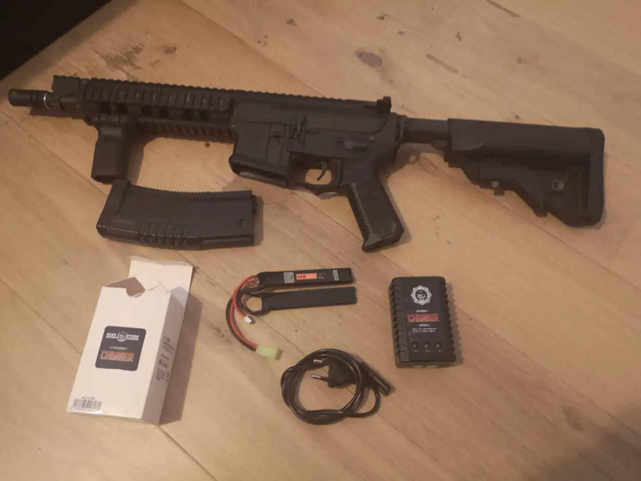 Je commence par une réplique type M4 de Amoeba. Vendu avec 4 chargeurs midcaps et sa batterie 7.4V ainsi que le chargeur de batterie.