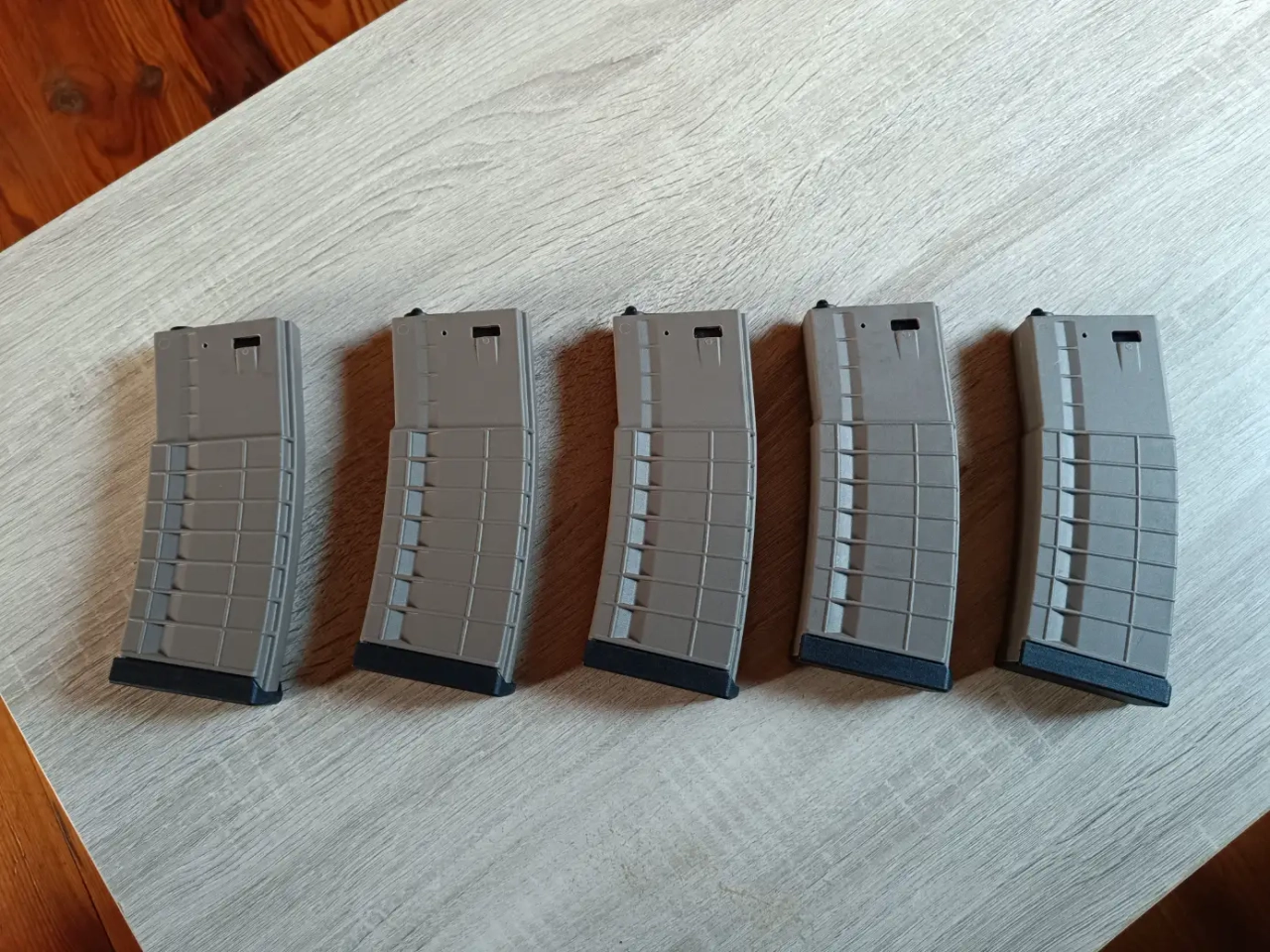 Je vends 5 chargeurs D-Day en parfait état avec possibilité passage low-cap (30 billes) / mid-cap (130 billes) couleur TAN pour AEG type M4.