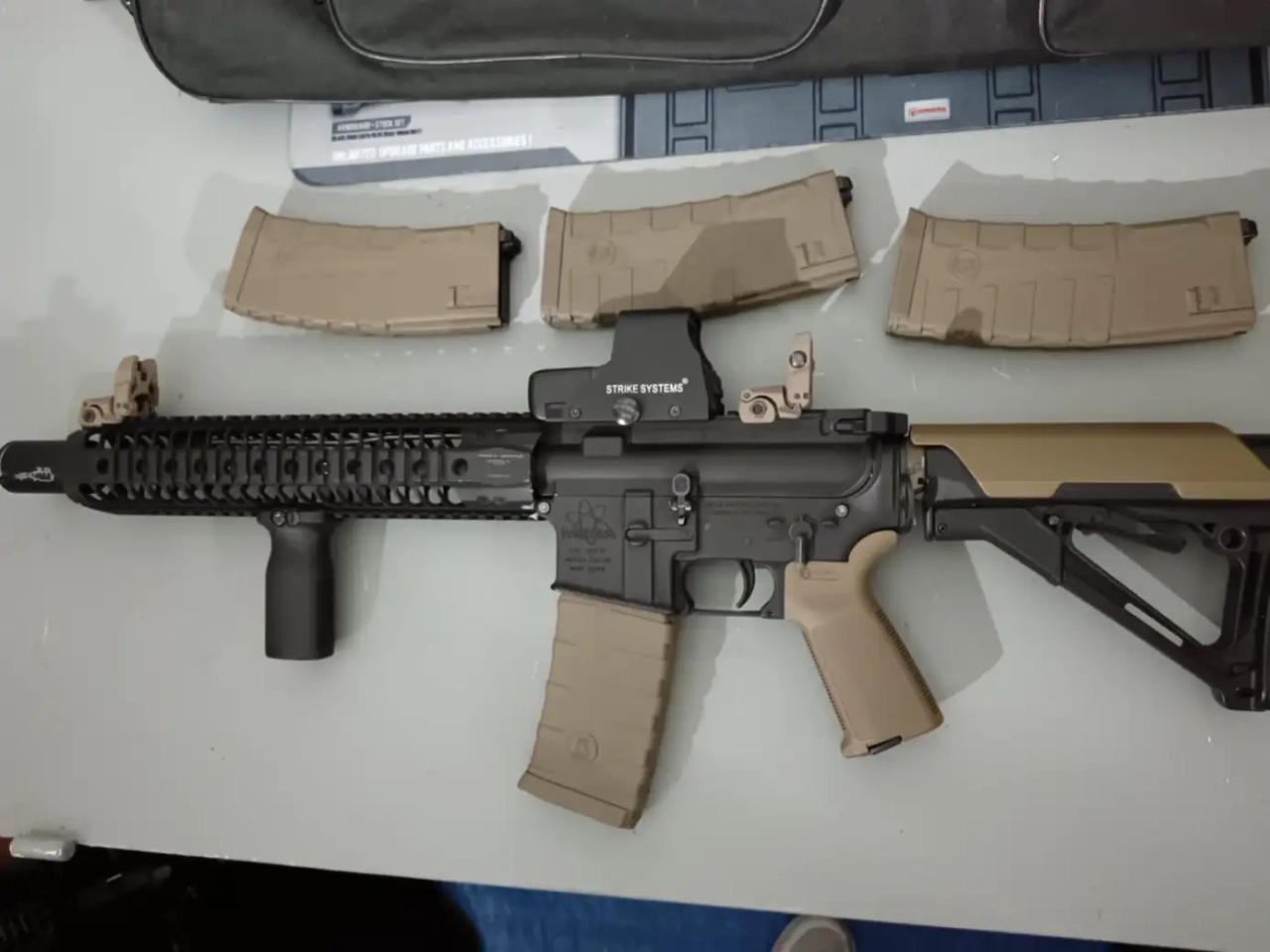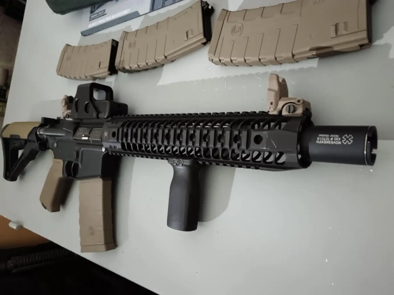 - accessoires visibles sur la photo : 4 chargeurs + viseur holographique + amplificateur de son noveske + visées flip-up