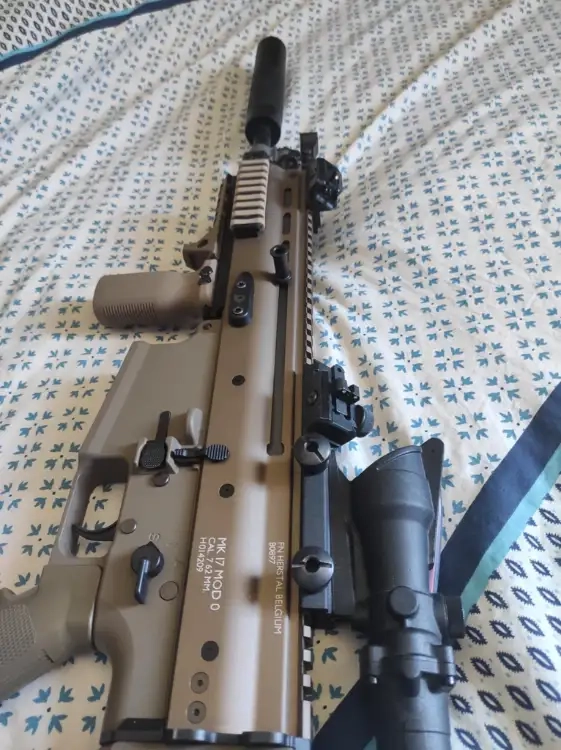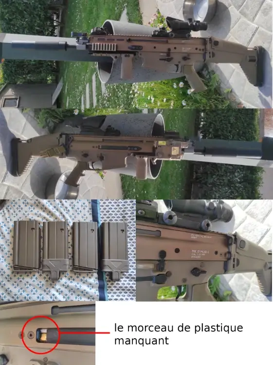Sur la réplique il y a un ACOG capteur de lumière (donc aucune pile à l'intérieur), un AN-PEQ fonctionnel de chez Element avec 3 mods (lampes, laser et laser infrarouge), j'ai aussi ajouté des organes de visée rapide inclinées à 45 degré, un silencieux et une poignée avec en plus un système pour caler la main rapidement, le seule défaut de la réplique se situe au niveau de l'éjecteur de douille (il manque le bout de plastique). Sinon elle est nickel.