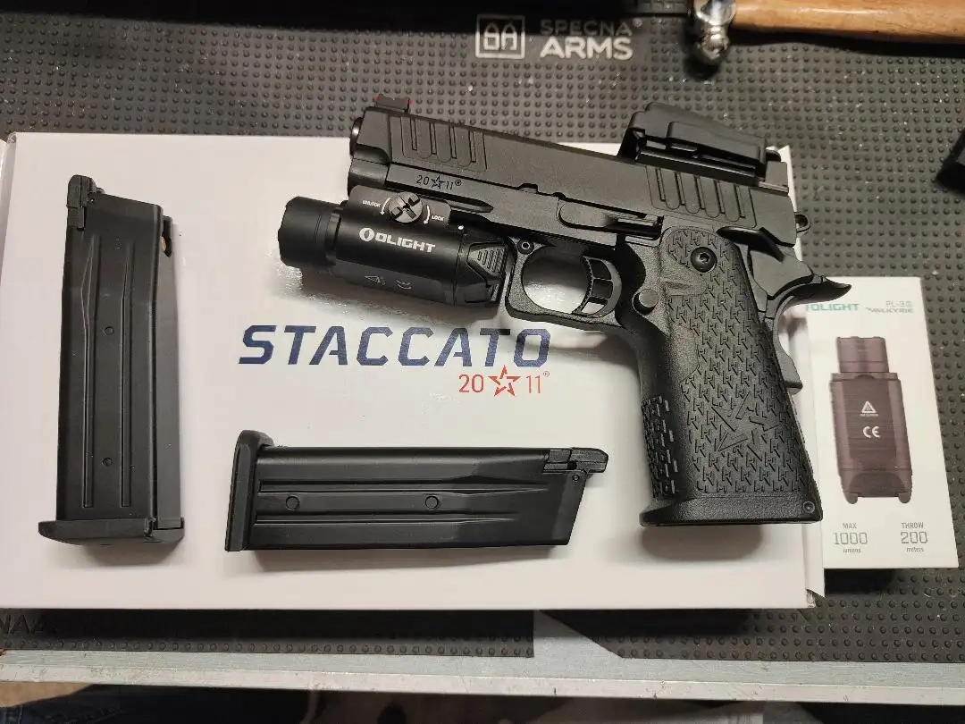 Bonjour je vend cette réplique neuve , jamais utilisée ( exposition et 1 chargeur sur cible ) dans sa boite d'origine avec 2 chargeurs gaz sans fuites , une lampe Olight Valkyrie PL-3 , un red dot pliable avec protection