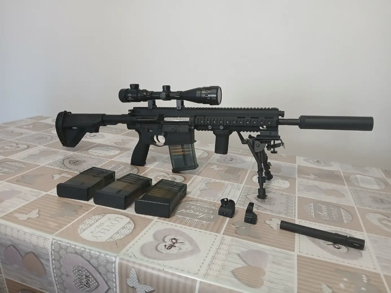 Bonjour je vend une HK417 sans les marquage officiel équipé d'une lunettes 3-9x40 rétro éclairé (bleu. rouge.vert ), un silencieux un trépied une poignée et 4 chargeur 75 bille. Puissance 400 fps idéale pour les anti sniper. Vendue sans batterie.
