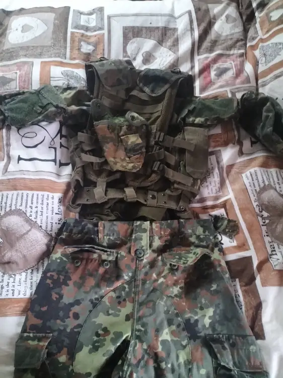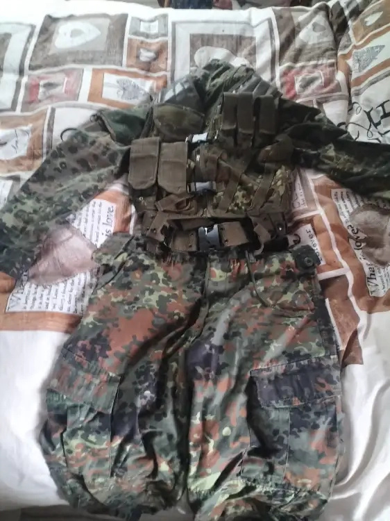 Bonjour je vends ma tenue complète d'airsoft Flecktarn comprend un pantalon et une chemise tactique taille S de la marque Invader Gear. le gilet tactique a reçu une bille sur le clipse mais il tient très bien.