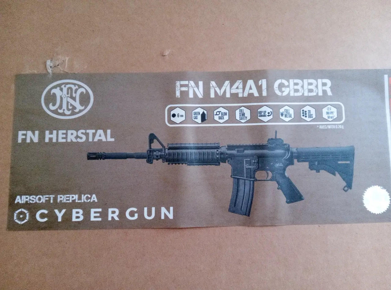 Modèle : FN M4A1 GBBR, blowback, full métal, hop Up réglable, sélecteur de tir (coup par coup / rafale / sécurité), blocage de culasse quand chargeur vide, puissance chroni entre 1 et 1.2J
