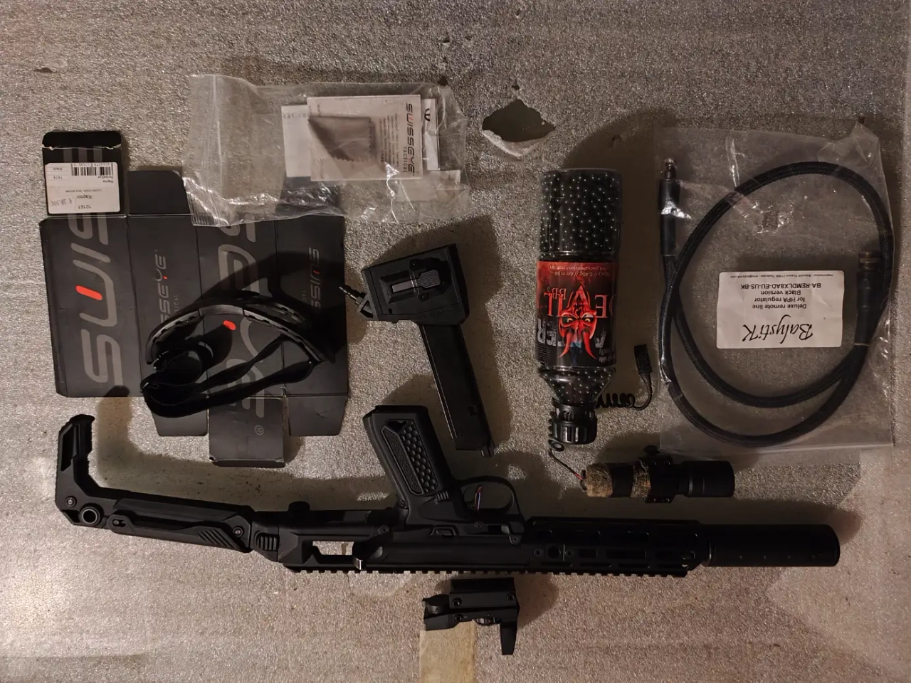 Garde main,cross rabattable, silencieux ,lampe swissarms ,lunette swiss eyes , bouteille de bille 0,40g devil noir ,malette et