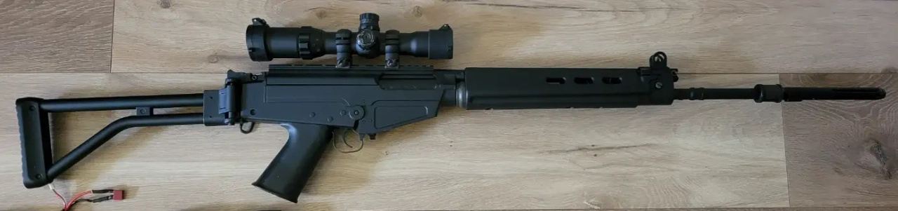 - Fal Para (crosse pliante) full lenght (canon long) de la marque King Arms, valeur d'achat à neuf à l'époque 450€, aujourd'hui introuvable. La carcasse est entièrement en métal, réplique de très belle qualité, robuste, et que l'on ne croise jamais en partie.