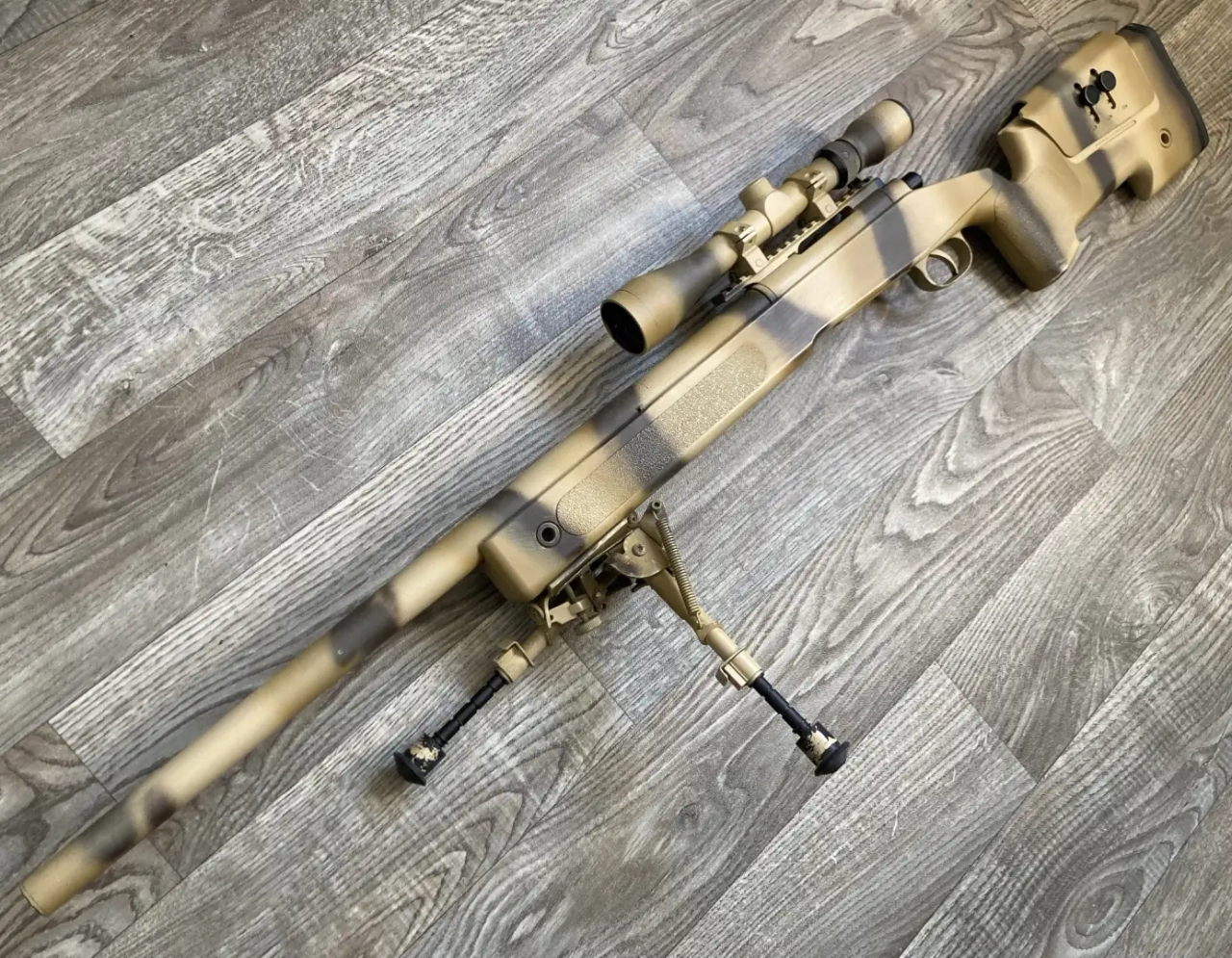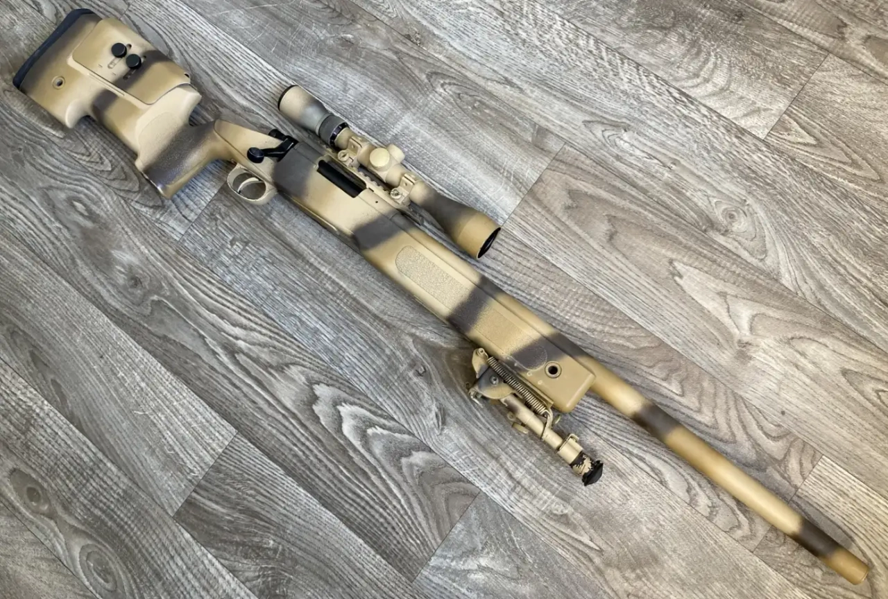 J'ai corrigé les défauts et j'y ai appliqué une peinture ainsi qu'une lunette et un bipied harris tout deux neufs. Le réplique est neuve et les effets d'usure sont volontaire. Idéal pour débuter sur snipe. Compatible avec pas mal de marques de pièce détachées donc possibilités d'optimisation.