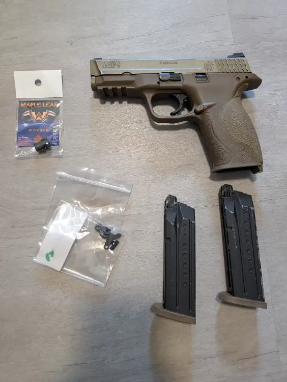 m&p9 de chez VFC (vendu par Cybergun). Vendu avec deux chargeurs et quelques pièces de rechange du groupe marteau.