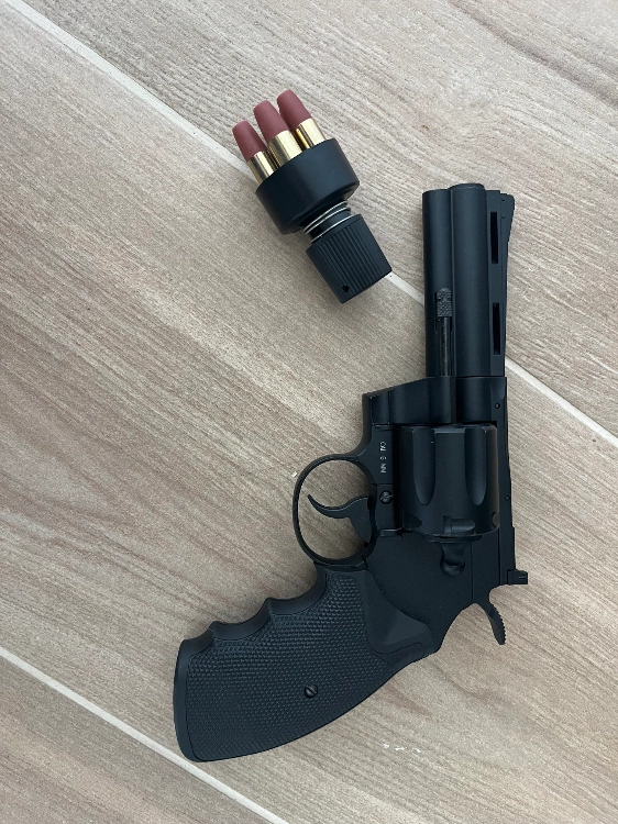 Je met en vente ce revolver réplique Smith & Wesson, je l’ai acheté pour le fun mais je ne l’ai jamais utilisé, j’ai les 6 étuis d’origine avec le chargeur rapide, fonctionne avec des sparclettes de CO2 dans la crosse