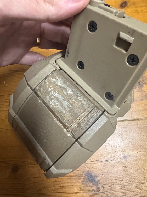 Il y a seulement une petite tache sur le côté gauche, car j’y avais collé une fausse une bande de munitions.