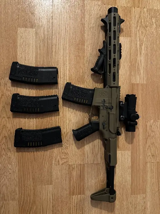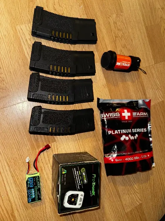 elle est équipée d'une poignée avant coudé et d'un viseur point rouge ACOG, 3 chargeur high cap 150 billes et un chargeur 300 billes.
