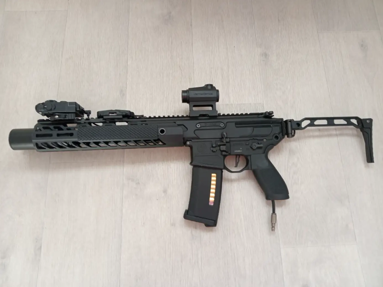 Il est composé d'un système Kytera semi auto v2, canon de précision raizen 6.05, joint hop up 60 macaron maple leaft, chambre hop up maxx model, set handguard 12 airsoft artisan, boitier DBAL a2 wadsn, lampe night evolution m600p,