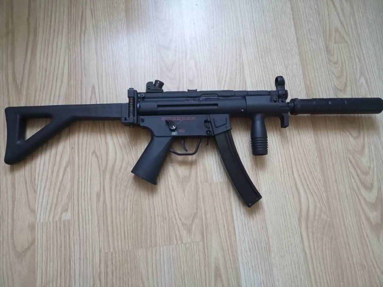 A vendre ou échanger un superbe MP5K, de la marque Star Rainbow Company (SRC), raide de neuf, juste exposé pour ma collection, il n'a jamais vu le terrain ni fait la moindre partie, j'ai juste tiré quelques bille pour le tester. La carcasse est en acier matricé et soudé comme le vrai, et les garnitures sont en fibre polymère, également comme le vrai.