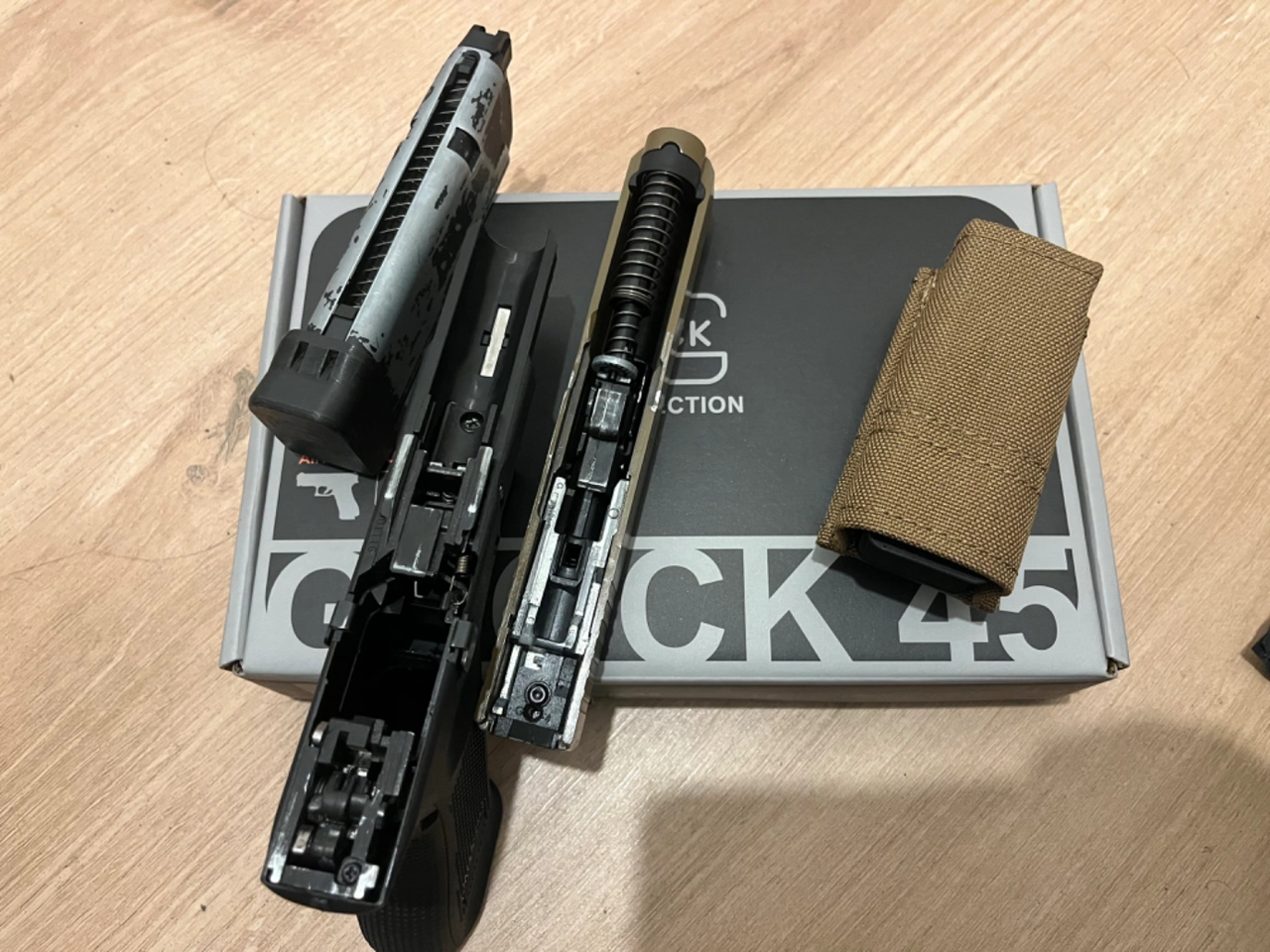 Suite à un effort de revaloriser mon glock 19X de VFC, j’ai créé avec les pièces qui restent un Glock de couleur mixte