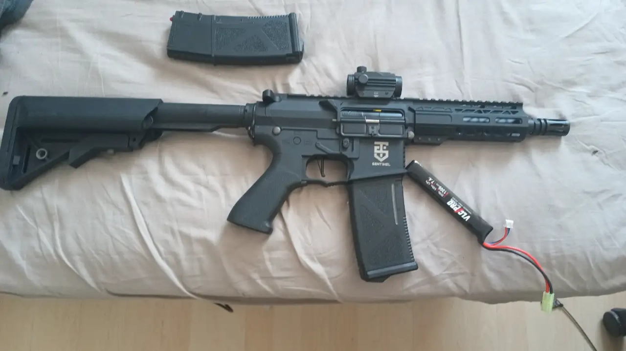 M4 rossi sentinel, j'inclus 2 chargeurs 120 billes qu'on peut brider à 30 billes (j'ai payé 40€ pour) en plus d'une lipo 7.4v, bref cette réplique n'a jamais vu de partie et tire très bien, j'ai juste tiré quelques chargeurs et réglé le viseur (je l'inclus pour 15€ de plus), je donne avec la facture et la boîte, c'est encore sous garantie. REMISE EN MAIN PROPRE ET PAIEMENT EN ESPÈCES UNIQUEMENT