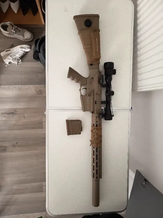 Fusil DMR Legion Rapax XXI M4 AEG Secutor - Tan avec lunette, un chargeur et une batterie comprise pour cette réplique.Je la vend car je ne m'en sert très rarement a fais en tout 5 parti. Elle sort environ 1,7 joule avec une lunette rétro éclairé.