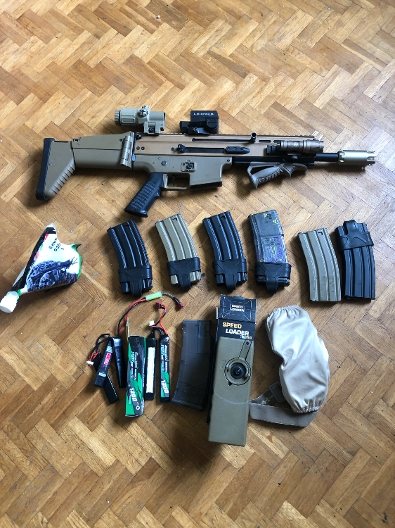 Bonjour, je vends mon Scar car je ne m’en sers plus, il a été entièrement révisé par un professionnel. Facture à l’appui, il dispose d’un traceur d’une lampe tactique d’un Red dot lespol ainsi qu’un magnifer il dispose également d’un mosfet titan le canon. Les engrenages tout a été changé et recalé par professionnel. Il est fourni avec six chargeurs, deux bb loader, chargeur Lipo deux batteries et lunettes