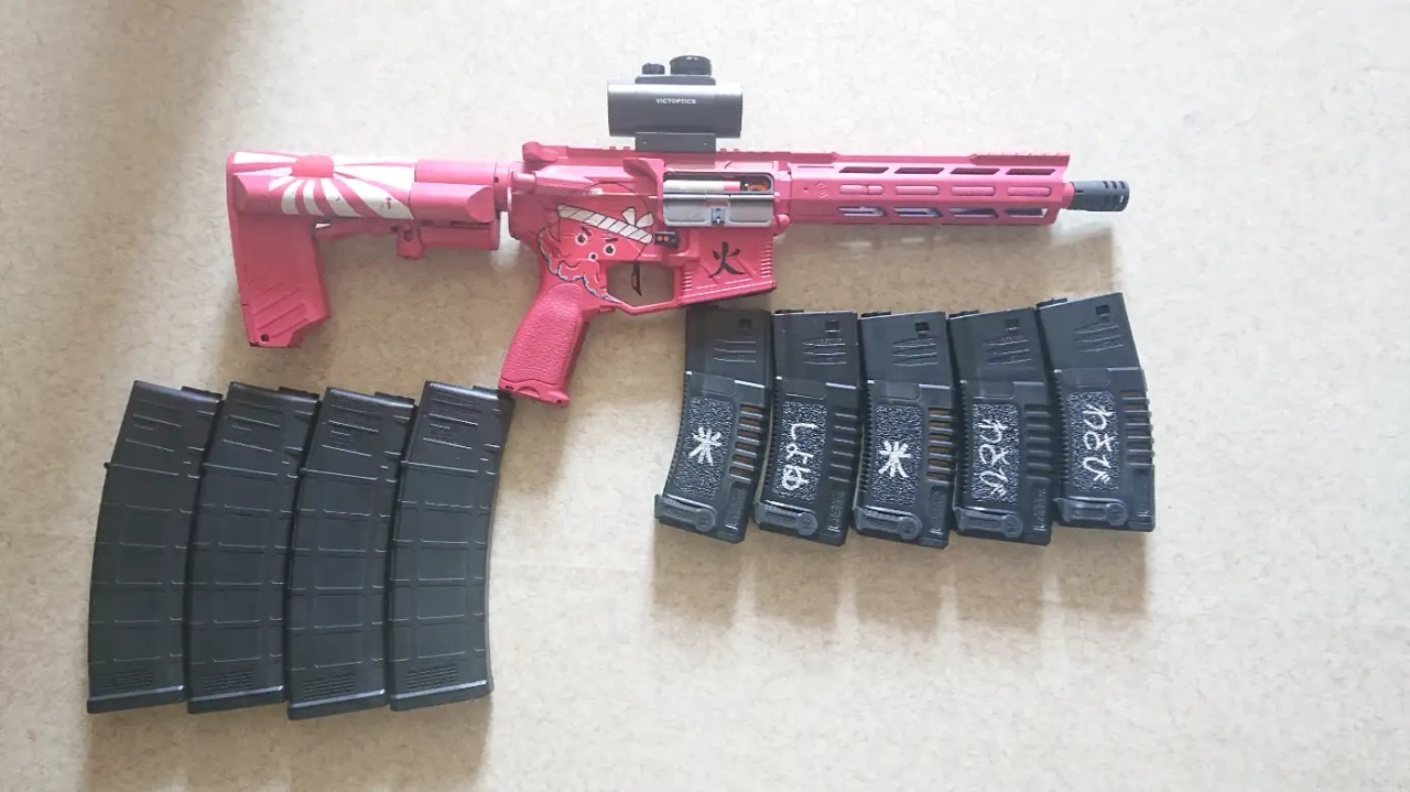 La réplique, un point rouge, les boîtes du titan, 5 chargeurs amoeba et 4 pmag ares (xxl) ainsi que la batterie 11.1V/1100mAh et une housse de transport