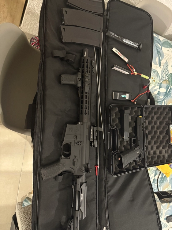 bonjour je vend un lot répliques specna arms edge full métal aeg avec 3 lipo traceur et viseur point rouge billes fluo fourni en 0,25g 4 chargeur etc état neuf servie 1 fois remise en main propre