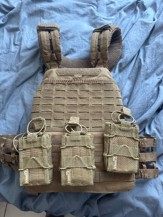 Gilet tactique 5.11 avec plaque et 3 poche pour les chargeur un défaut sur l’épaule mais pas méchant 140 euros valeur total 250 a peu près