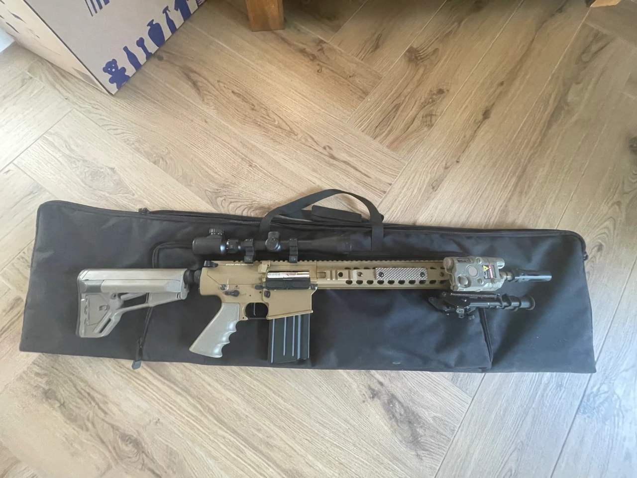 Un M110k Specna arms (DMR) upgrade avec accessoires et 6 chargeurs mid cap