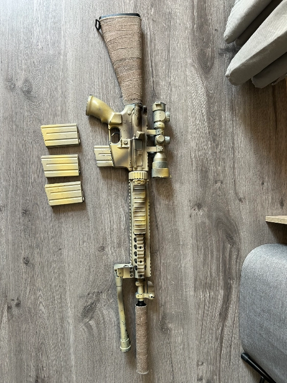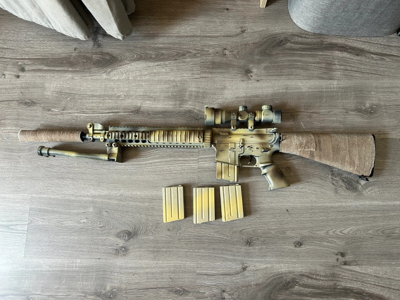 Vendue avec lunette (piles fonctionnelles) grossissement 2-6X32 avec lumière verte et rouge, bipied, silencieux (le canon interne va à la moitié de silencieux à peu près), 3 mid cap et 1 high cap. Je donne une batterie lipo 7,4V avec.