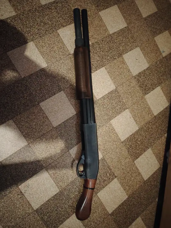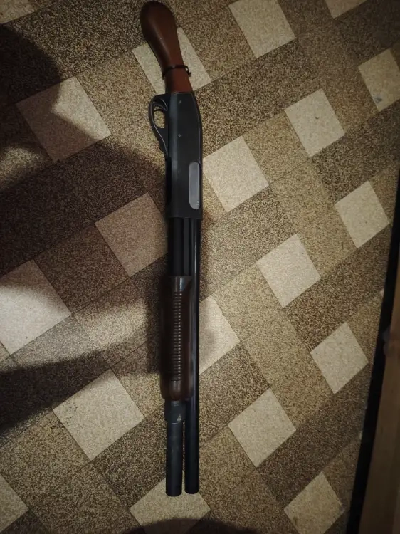 Fusil à pompe de marque marui de couleur noire avec manche imitation bois.