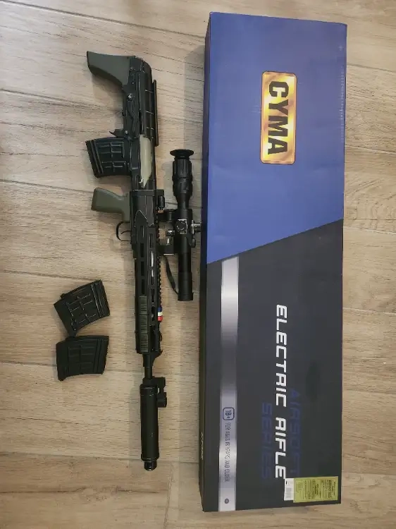 Elle est vendu avec sa boite d'origine avec 2 chargeurs mid cap metal de 100 billes et un chargeur high cap metal, une lunette style pso 1 matrix (140€ neuf) dont le rétroéclairage ne fonctionne plus et une seconde lunette LPVO à zoom variable de chez Novritsch (100€ neuf) ainsi que 9 couvre rails mlok et une batterie 11.1v 1200 mAh ATM.