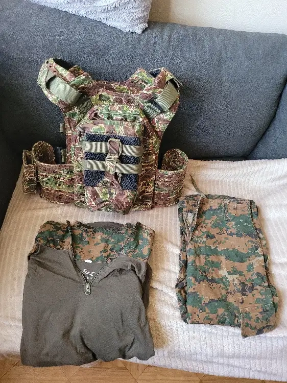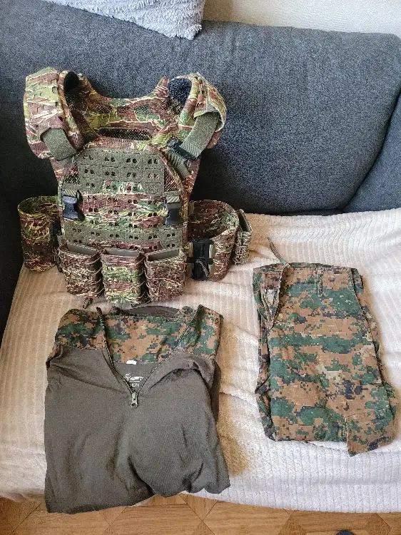bonjour je vend une tenue complète Novritsch gilet tactique avec 4 porte chargeurs et un porte bouteille avec un haut et un bas merci