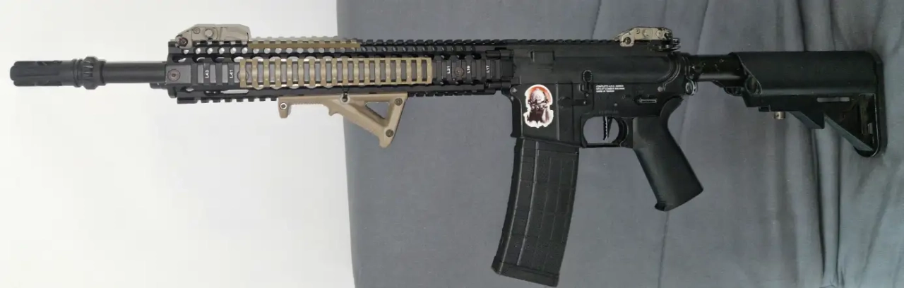 il est vendu tout d'origine mis à part une poignée, 2 chargeur un hight cap a molette et un mid cap, organe de visée flip up av et ar, couvre rails, lampe wasdn, garde main pica Daniel Défense 12.5 pouce/inch avec marquage et attache sangle QD avant non présent sur les photos mes présent pour la vente.