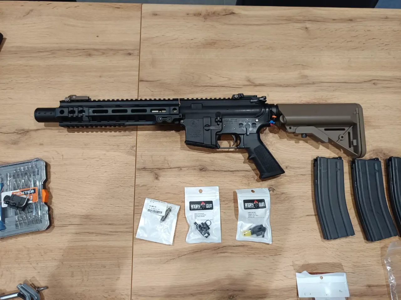 À vendre mws mk18 gbbr upgrade, nozzle avec npas réglable, ressort 110% pour une meilleure réactivité, 4 chargeurs dont un qui pose des problèmes de retour de culasse (sûrement les lèvres qui ont bougé) bloc hopup en deux parties complet angry gun, ressort de nozzle neuf, fonctionne très bien à la 0.30 g