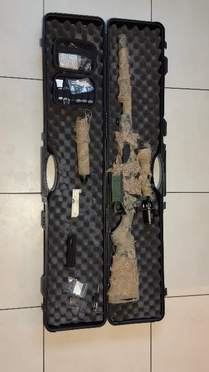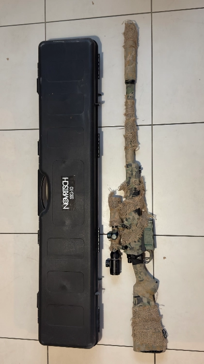 Réplique novritsch, peut utilisé moins de 10 fois en extérieur et moins de 20 fois en stand de tire. État excellent et fournit avec des équipements supplémentaires et avec un camouflage fait maison mais retirable rien n’est collé sur le bâti.
