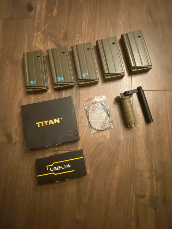 Poignée droite, repose poignet, rallonge de canon et les organes de visée mécanique d’origine.