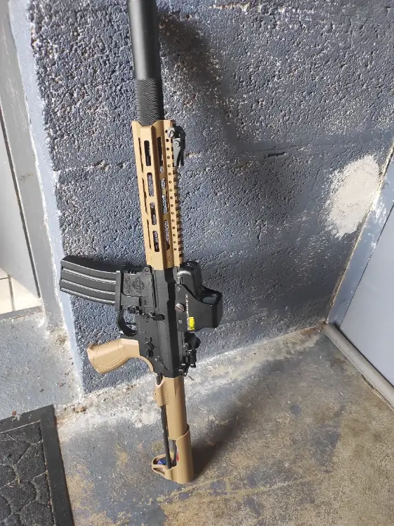 Elle est vendu sans poignée ni eotech, ni lampe. Fournis cependant avec silencieux englobant le canon externe et interne, 2 chargeurs mid cap AR15 et 1 batterie. Très bonne réactivité d'origine.