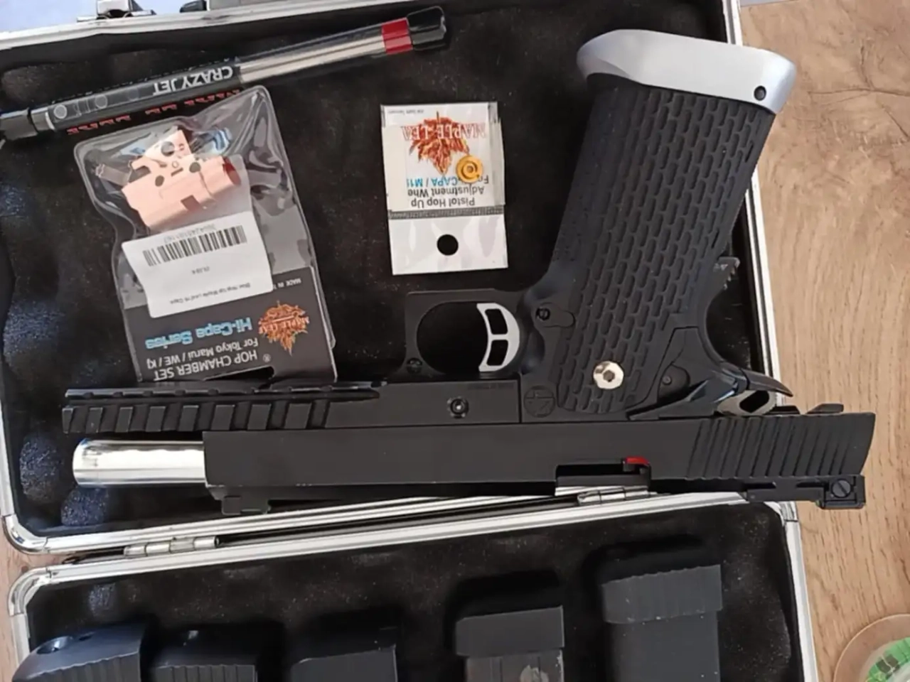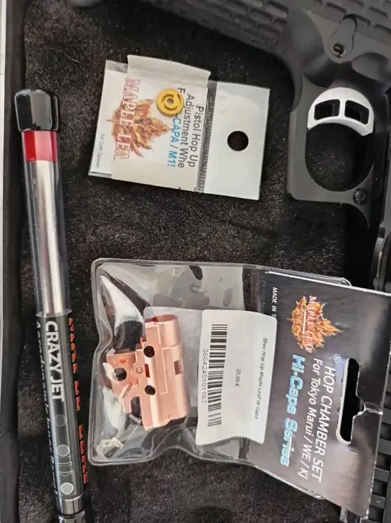 à vendre kp-06 de chez kjworks parfaitement fonctionnel, fourni avec trois chargeurs gaz, et deux C02, les deux c02 sont pour ainsi dire comme neufs, un joint decepticon 50° de chez Maple leaf, canon/bloc/molette Maple leafs neuf vendus en plus, vendu avec sa malle si il part avant le 4/07/2025 j'offre dix cartouches de c02 neuves avec