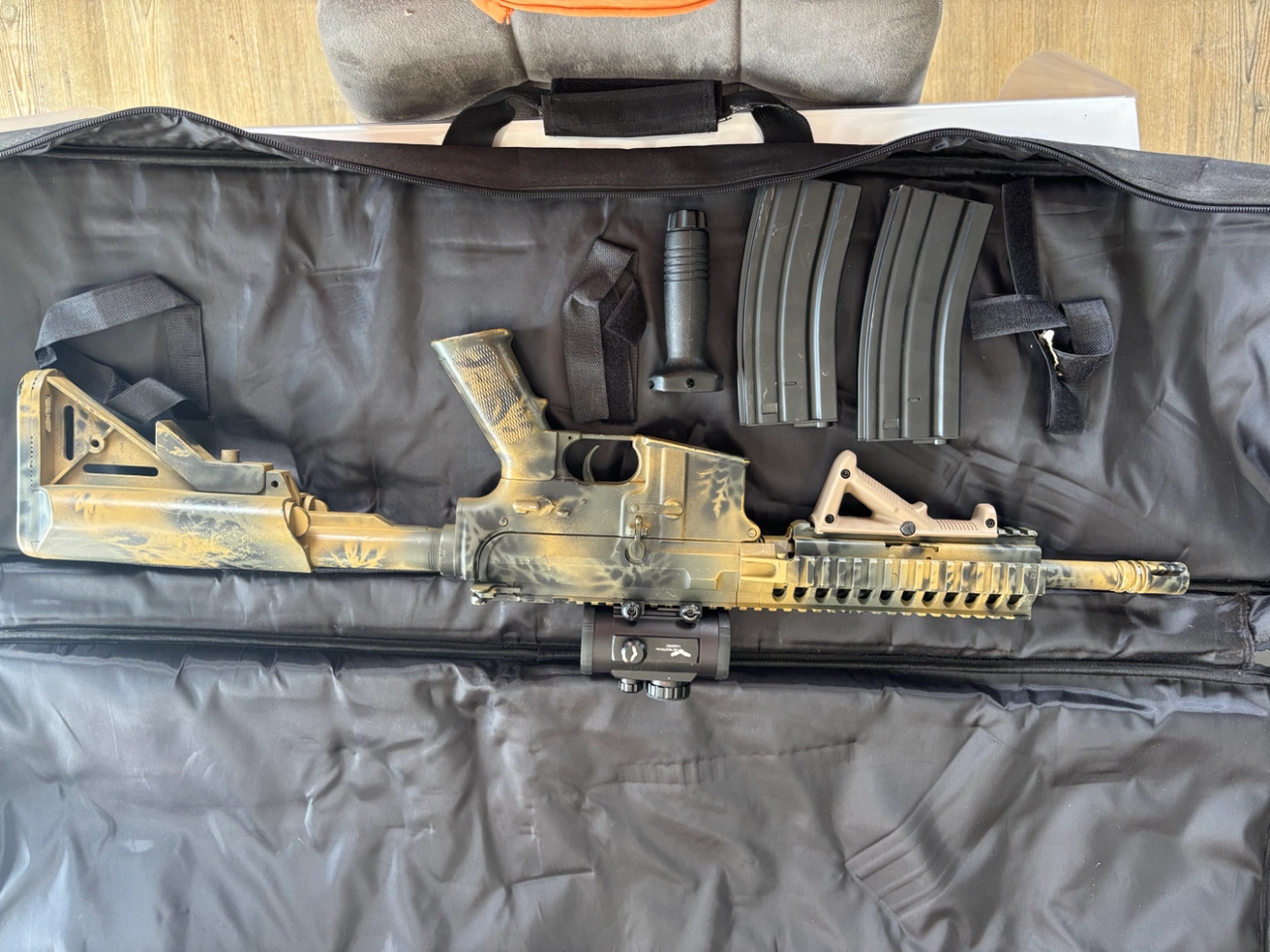 Vend m4 paintjob fait maison red dot fournie avec ainsi que 2 chargeur 300 coups et 2 batterie une 7,4v et 9,1v