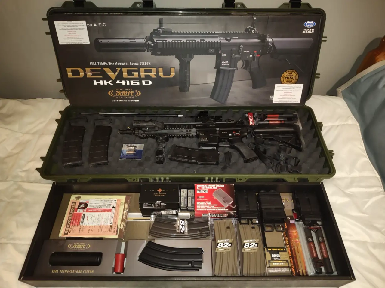 Je propose mon HK, parfaitement fonctionnel, avec ses pièces d'origine. Équipé d'une lampe et d'un viseur. La boîte, ses documents, ainsi q'une malette de transport. Chargeurs, chargeur de batterie, batteries, clés, pièces de rechange (fusibles, joints hop-up).