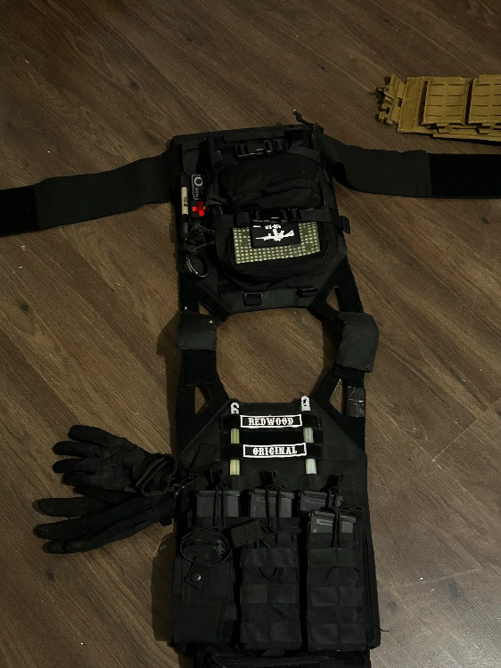 • Plate Carrier Noir : Look "Low Profile / PMC", équipé d'un Backpack, patchs (Redwood Original) et bâtons de signalisation (Cyalumes).